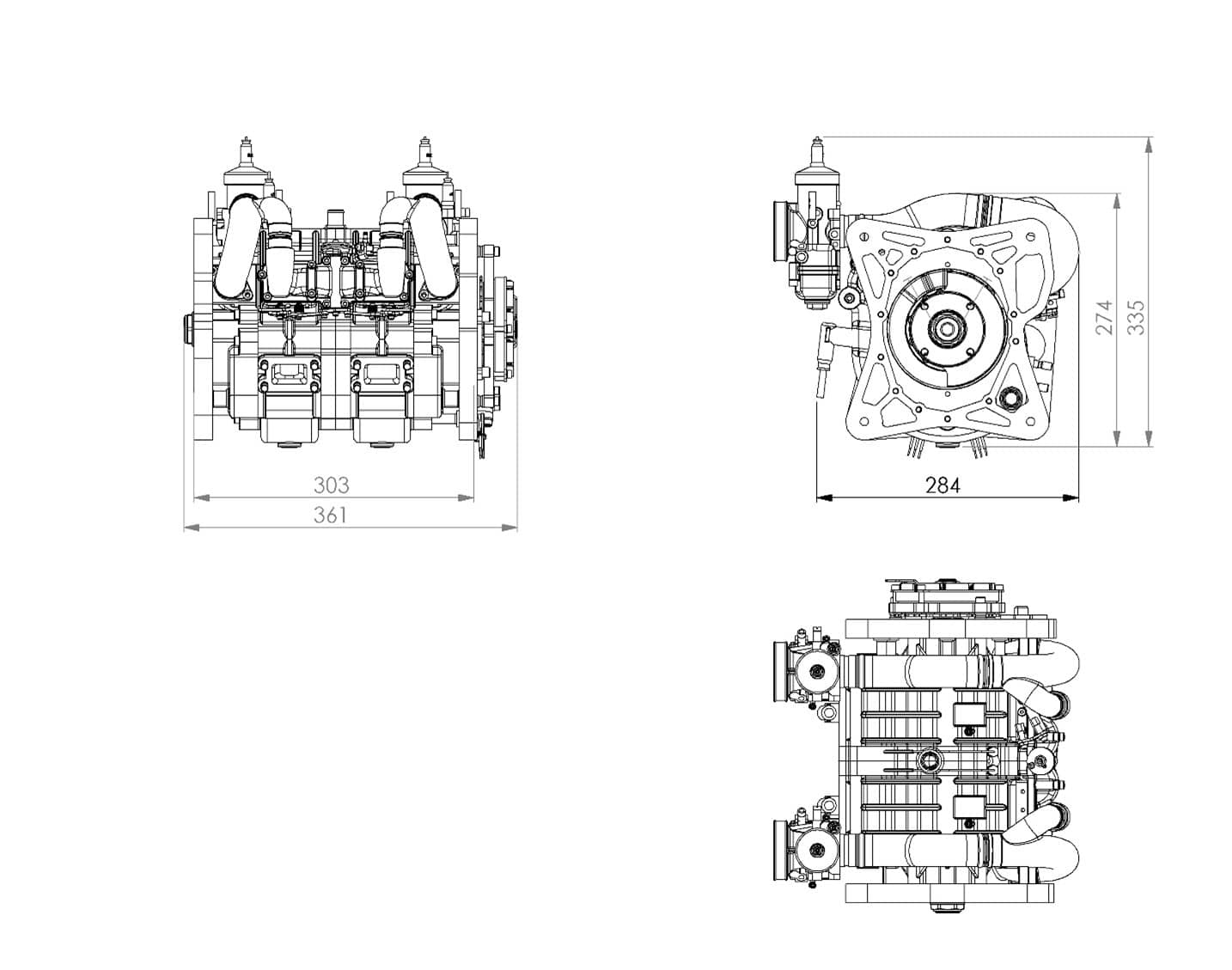With an additional inlet air cooler the engine’s continuous power can be increased to 90-95% of peak power, and it has run successfully on Jet A-1 fuel.The porting system is also suitable for charging, especially when applying a novel charging concept (patent granted in Germany, China, India) USA is pending, which can further increase peak and continuous power to >40kW and also act as an altitude compensation.